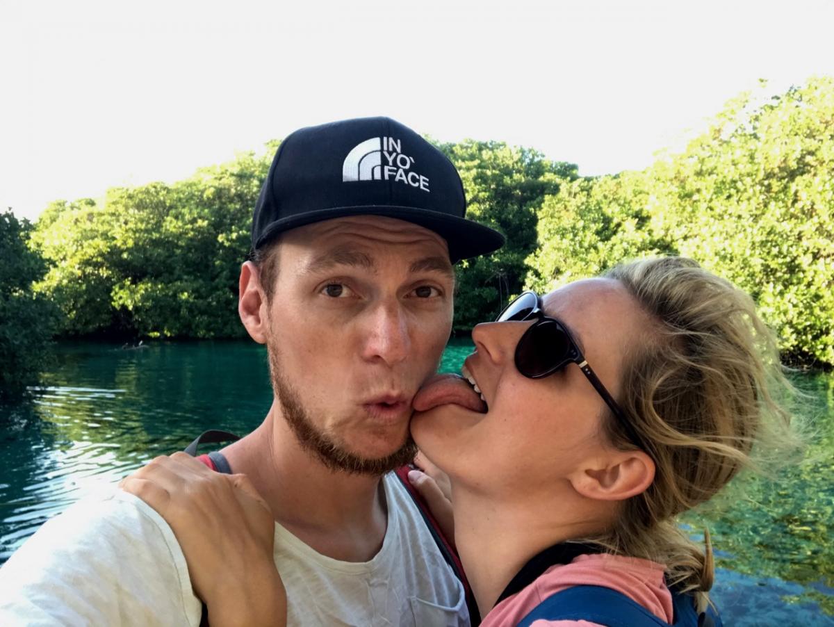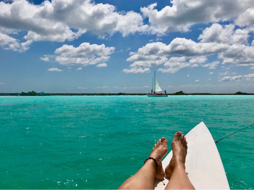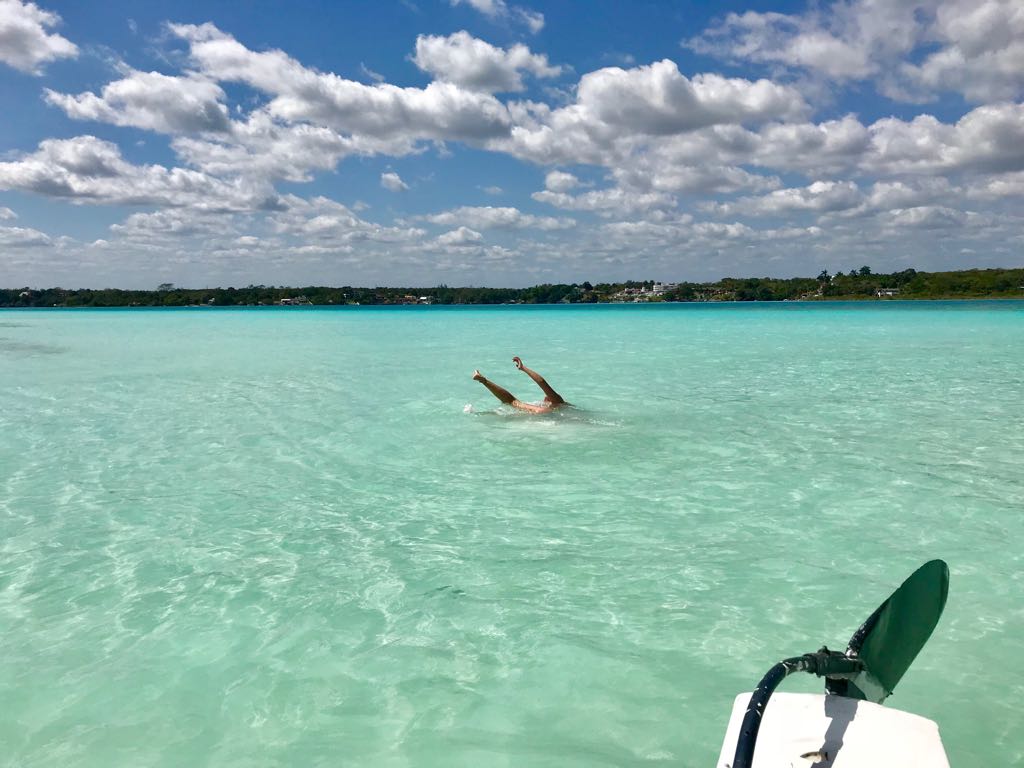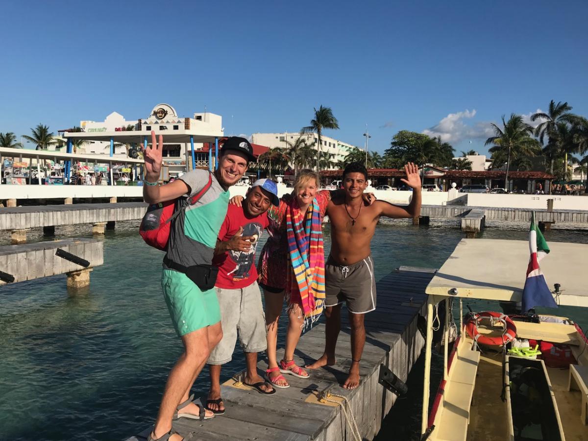 Vor der Küste der Insel Cozumel ist das Wasser so klar, dass wir Rochen und Baracudas locker aus 50m Entfernung beobachten konnten. Wir buchten auch mal einen Trip zum berühmten Riff Banco Chinchorro. 20km vor der Küste Mahahuals gelegen, ähnelte die Hinfahrt mit dem Boot dorthin zunächst einer anderthalbstündigen Raftingfahrt gegen die Wellen des Atlantiks. Wir fühlten uns ein bisschen wie im Ötztal bei Wildwasserstufe 4 und waren nass bis auf die Haut, als wir endlich im Paradies ankamen. Allerdings lohnten sich diese Strapazen absolut mit Einblicken in eine einzigartige Unterwasserwelt. Wir beobachteten meterlange Langusten und Hummer, die ihre Höhlen beschützten, schwebende Stachelrochen, schlafende Ammenhaie sowie eine Vielfalt bunter Tropenfische à la Nemo und Dori. Das alles war umgeben von farbenfrohen Korallen und Schwämmen, die grazil von den Wellen zum Leben erweckt wurden. Viele dieser Eindrücke konnten wir mit unserem Equipment leider nicht festhalten. In unserem Gedächtnis werden sie jedoch noch lange bleiben. Nach einer derartigen Abenteuerfahrt ist es nicht verwunderlich, dass wir gleich eine handvoll toller Leute kennenlernten – allen voran Anna und Mat. Die beiden arbeiten für „Ärzte ohne Grenzen“, sind extrem viel rumgekommen und hatten viel zu erzählen. In der Seenlandschaft von Bacalar verbrachten wir einen traumhaften Tag mit ihnen. Wir charterten einen kleinen Katamaran ohne nervenden Motor, die Sonne schien, das Wasser schimmerte von türkis bis royalblau, das Bier hatte Litergröße und unser Kapitän „Smokey Mc Pot“ aka Fernando rauchte Friedenspfeife mit uns – der Tag war perfekt!