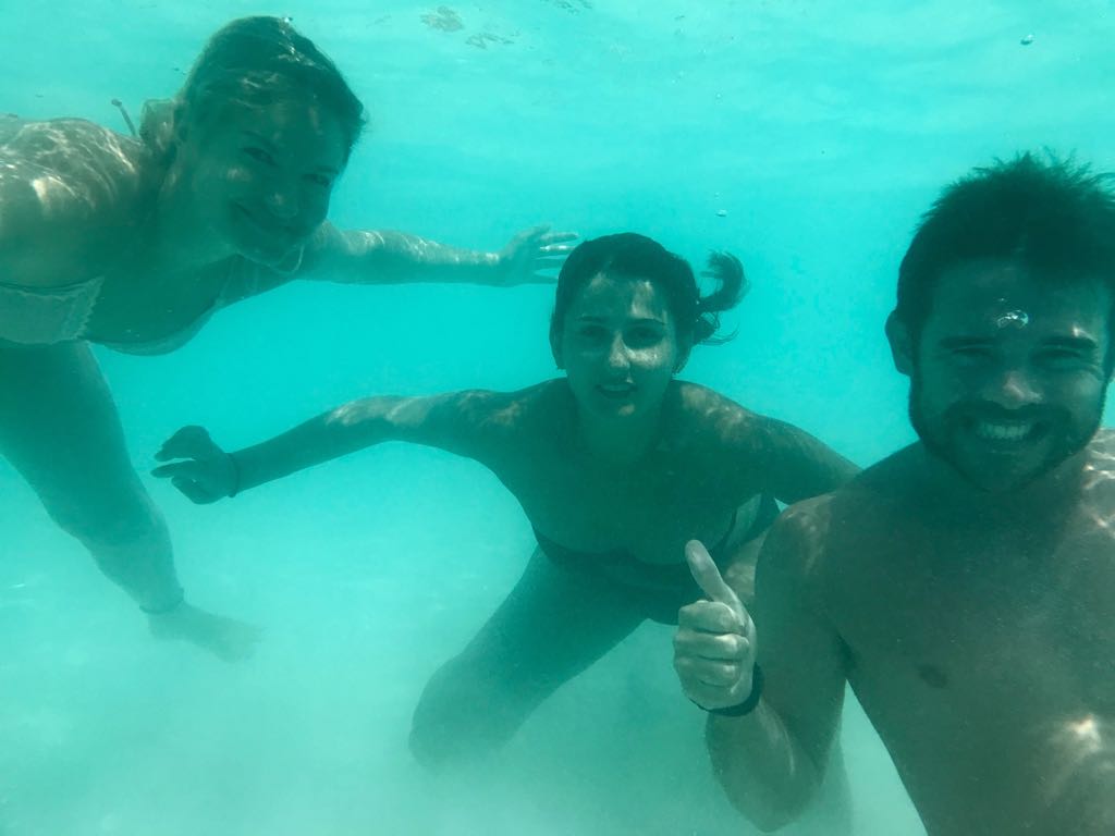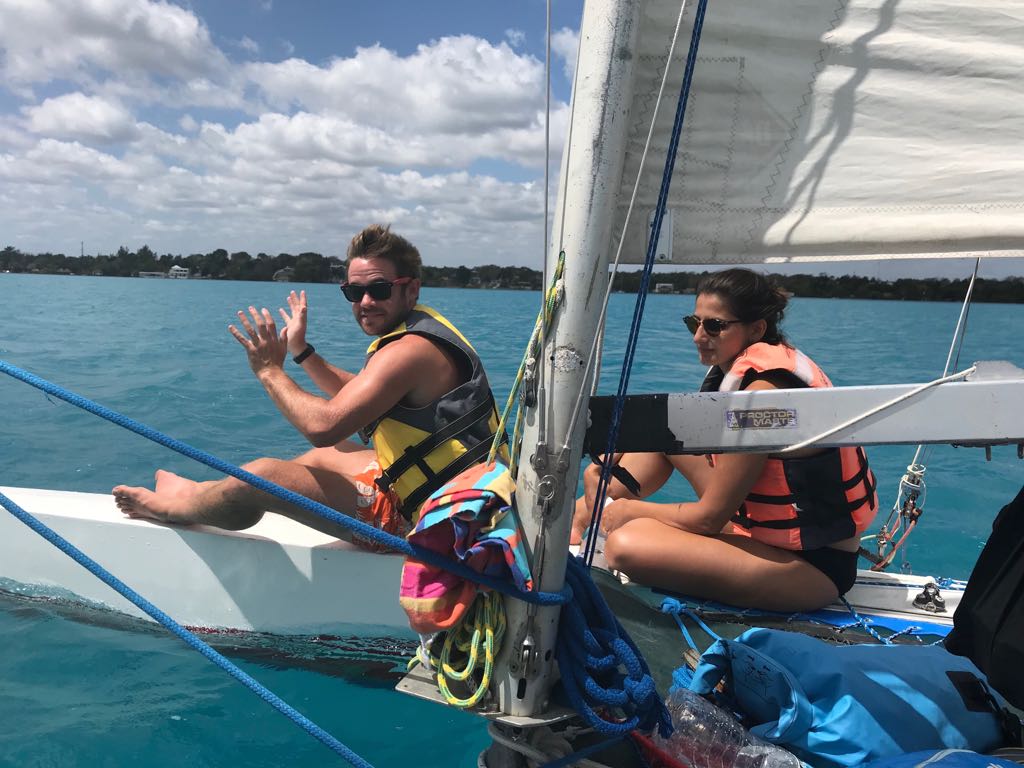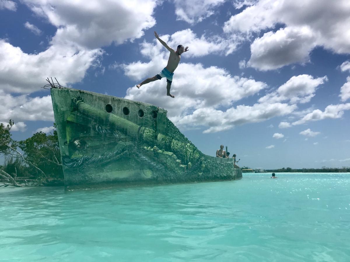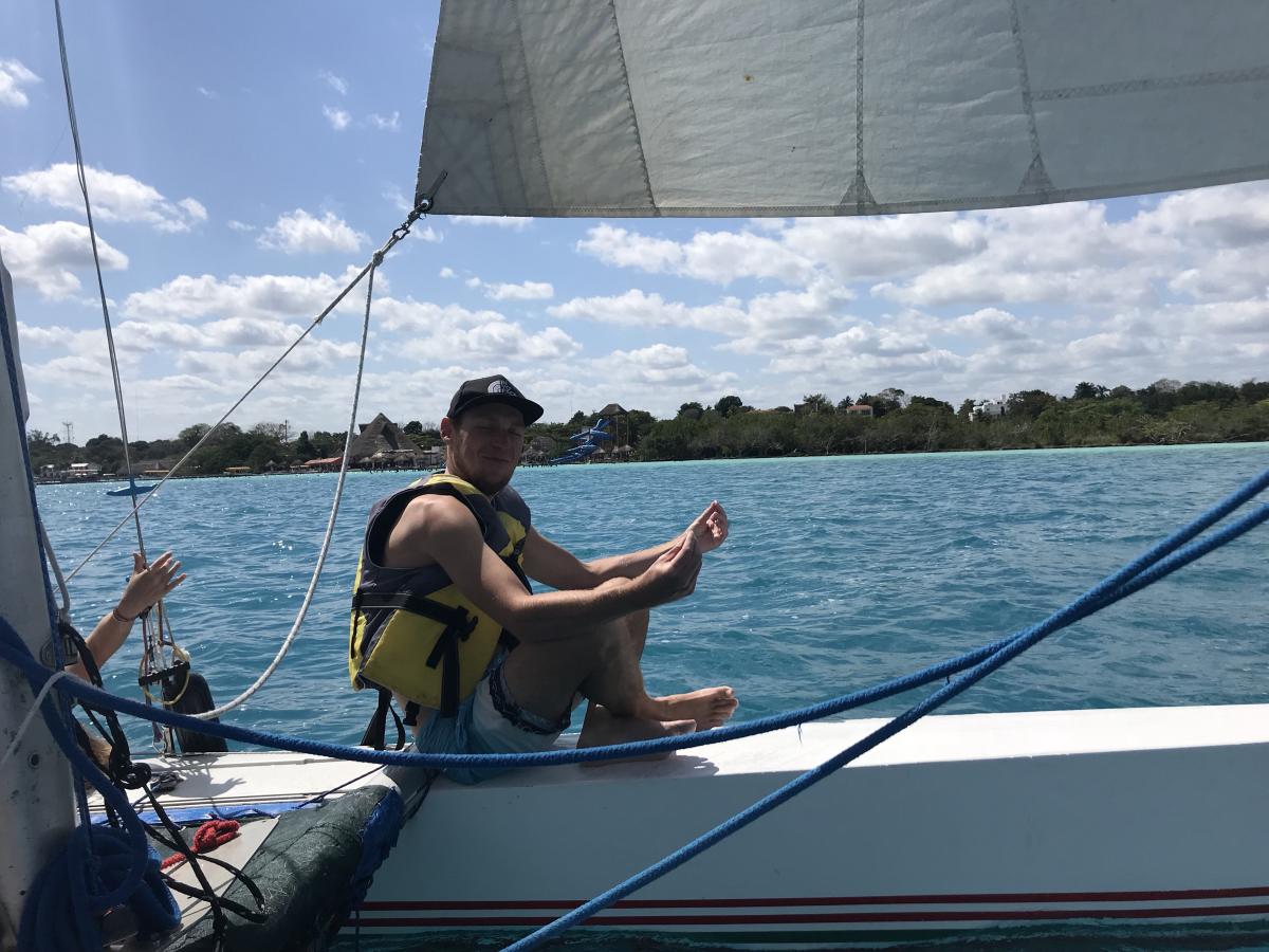 Vor der Küste der Insel Cozumel ist das Wasser so klar, dass wir Rochen und Baracudas locker aus 50m Entfernung beobachten konnten. Wir buchten auch mal einen Trip zum berühmten Riff Banco Chinchorro. 20km vor der Küste Mahahuals gelegen, ähnelte die Hinfahrt mit dem Boot dorthin zunächst einer anderthalbstündigen Raftingfahrt gegen die Wellen des Atlantiks. Wir fühlten uns ein bisschen wie im Ötztal bei Wildwasserstufe 4 und waren nass bis auf die Haut, als wir endlich im Paradies ankamen. Allerdings lohnten sich diese Strapazen absolut mit Einblicken in eine einzigartige Unterwasserwelt. Wir beobachteten meterlange Langusten und Hummer, die ihre Höhlen beschützten, schwebende Stachelrochen, schlafende Ammenhaie sowie eine Vielfalt bunter Tropenfische à la Nemo und Dori. Das alles war umgeben von farbenfrohen Korallen und Schwämmen, die grazil von den Wellen zum Leben erweckt wurden. Viele dieser Eindrücke konnten wir mit unserem Equipment leider nicht festhalten. In unserem Gedächtnis werden sie jedoch noch lange bleiben. Nach einer derartigen Abenteuerfahrt ist es nicht verwunderlich, dass wir gleich eine handvoll toller Leute kennenlernten – allen voran Anna und Mat. Die beiden arbeiten für „Ärzte ohne Grenzen“, sind extrem viel rumgekommen und hatten viel zu erzählen. In der Seenlandschaft von Bacalar verbrachten wir einen traumhaften Tag mit ihnen. Wir charterten einen kleinen Katamaran ohne nervenden Motor, die Sonne schien, das Wasser schimmerte von türkis bis royalblau, das Bier hatte Litergröße und unser Kapitän „Smokey Mc Pot“ aka Fernando rauchte Friedenspfeife mit uns – der Tag war perfekt!